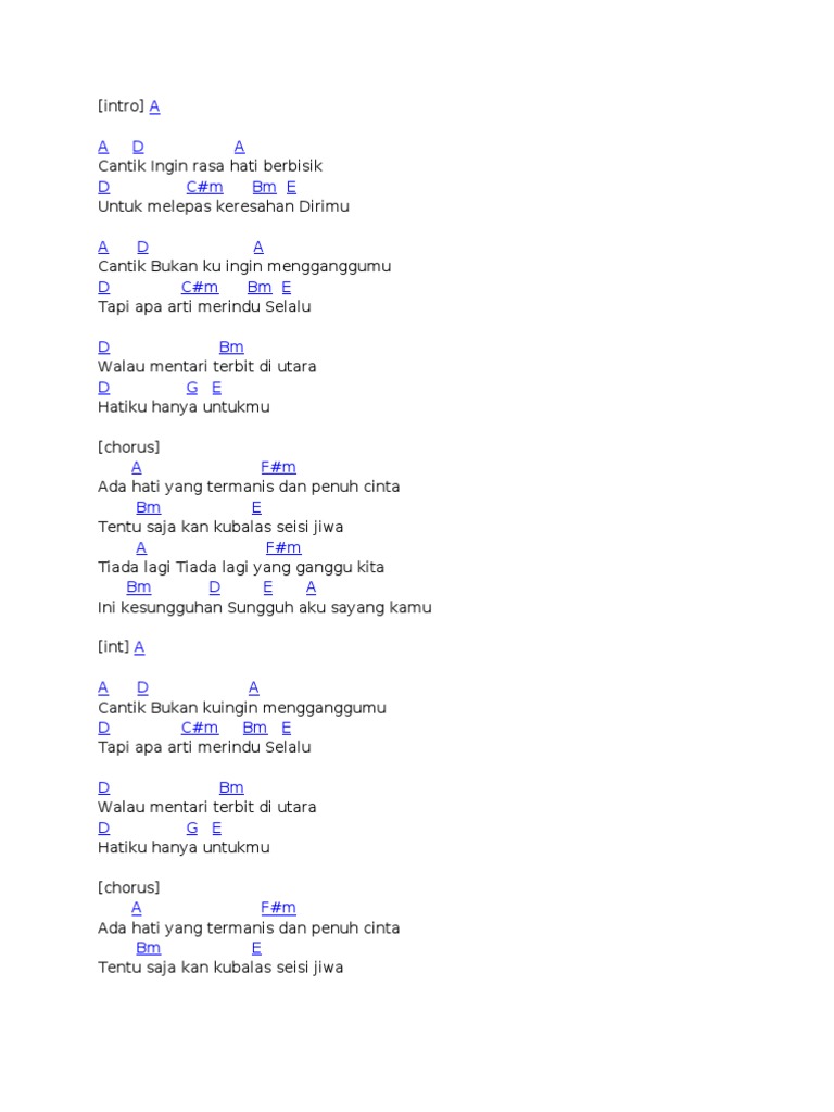 Bukan kuingin mengganggumu D Cm Bm tapi apa arti merindu. A D A Cantik Bukan kuingin mengganggumu D Cm Bm E Tapi apa arti merindu Selalu. Ada hati yang termanis dan penuh cinta Tentu saja kan kubalas seisi jiwa Tiada lagi Tiada lagi yang ganggu kita Ini kesungguhan Sungguh aku sayang kamu Heya yaya heya Ini kesungguhan Sungguh aku sayang kamu Submit Corrections.